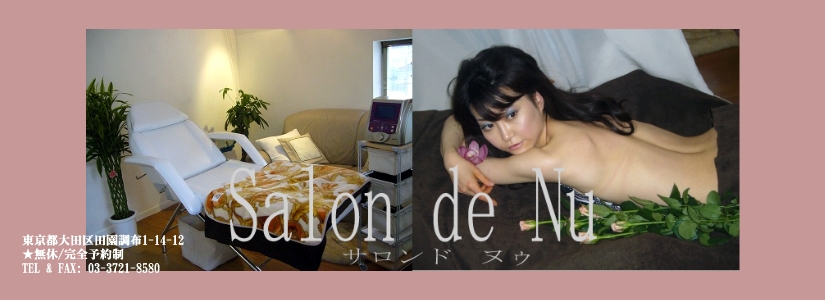 サロンドNuはフェイシャル、BODY,ネイルの「トータルビューテイサロン」で、住宅街にある一軒家のエステサロン。Nuとはフランスのアールヌーボーから来ている言葉で「飾らない」「ナチュラル」という意味です。「素材」を生かし、本来の「美」を引き出す事を目指します。また、リーズナブルな価格設定なので何度でもお通い戴けます。完全予約の一軒家サロンだからゆったりとした貴女だけの空間をお約束します。「ストレス」からホルモンのバランスが崩れ、お肌のトラブルや肥満、肩こり、冷えにも繋がります。心と体の癒しをお届けするのが当サロン「Nu」。リンパを意識したハンドマッサージで癒されて下さい。